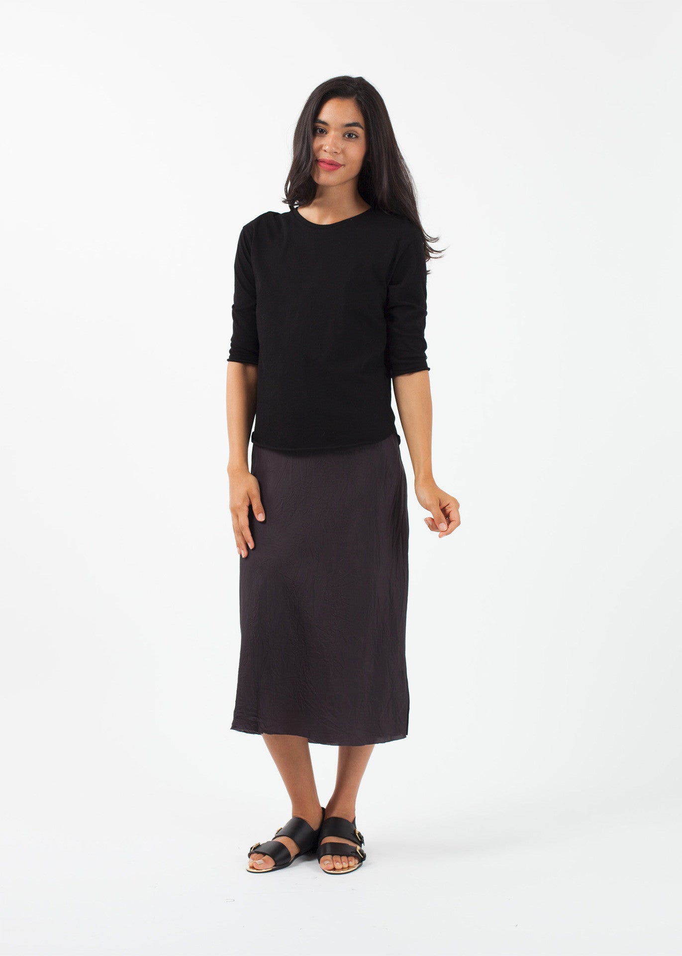 Pirouette into summer. The Ballet Top from Organic by John Patrick is highly versatile in a dreamy cotton. 3/4 inch sleeves. Raw hemming. 100% Organic Cotton. Made in Peru. Ashley is wearing an X-Small.