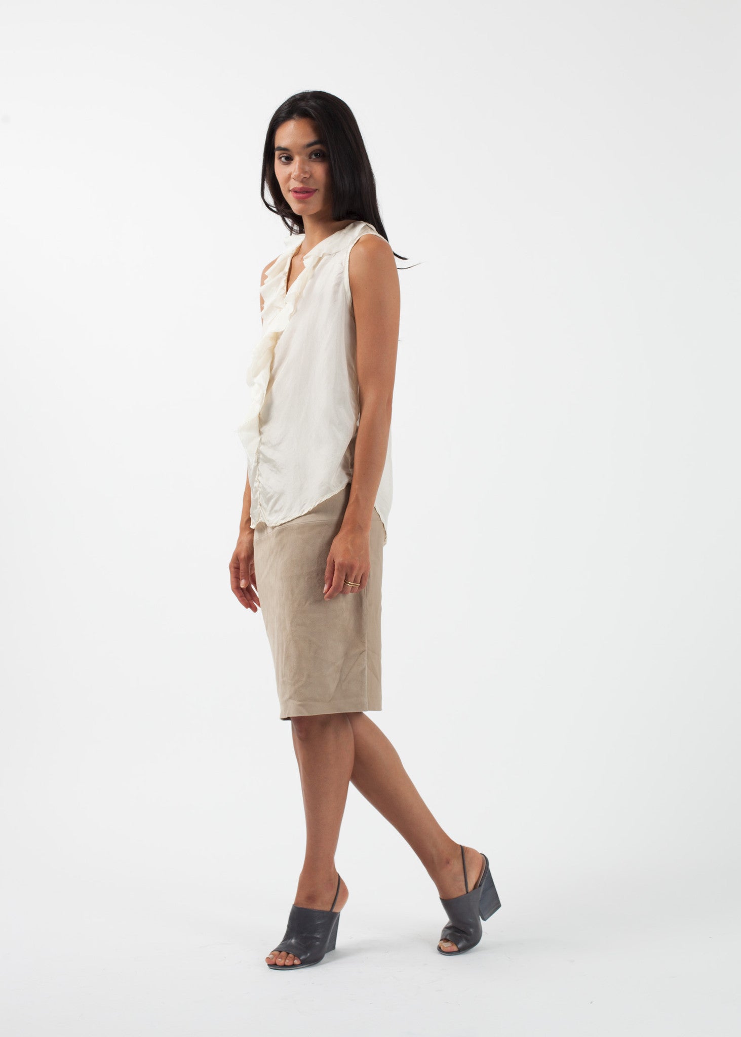 The sleeveless Ruffle Top inspires. Classic without too many frills. V-neckline framed in ruffles. Pip-Squeak Chapeau. Color Cream. 100% Silk. Made in U.S.A. Ashley is wearing a Small.