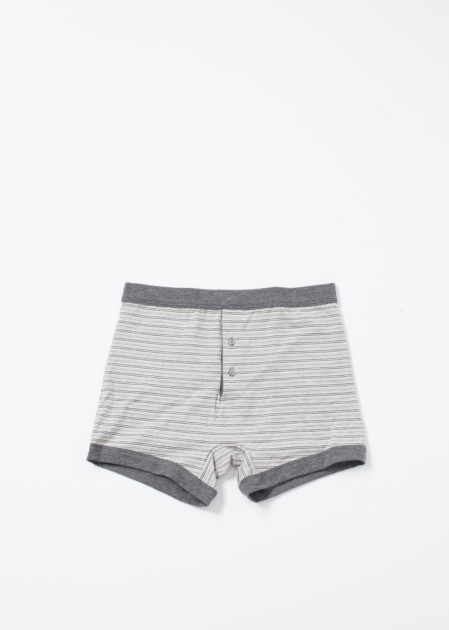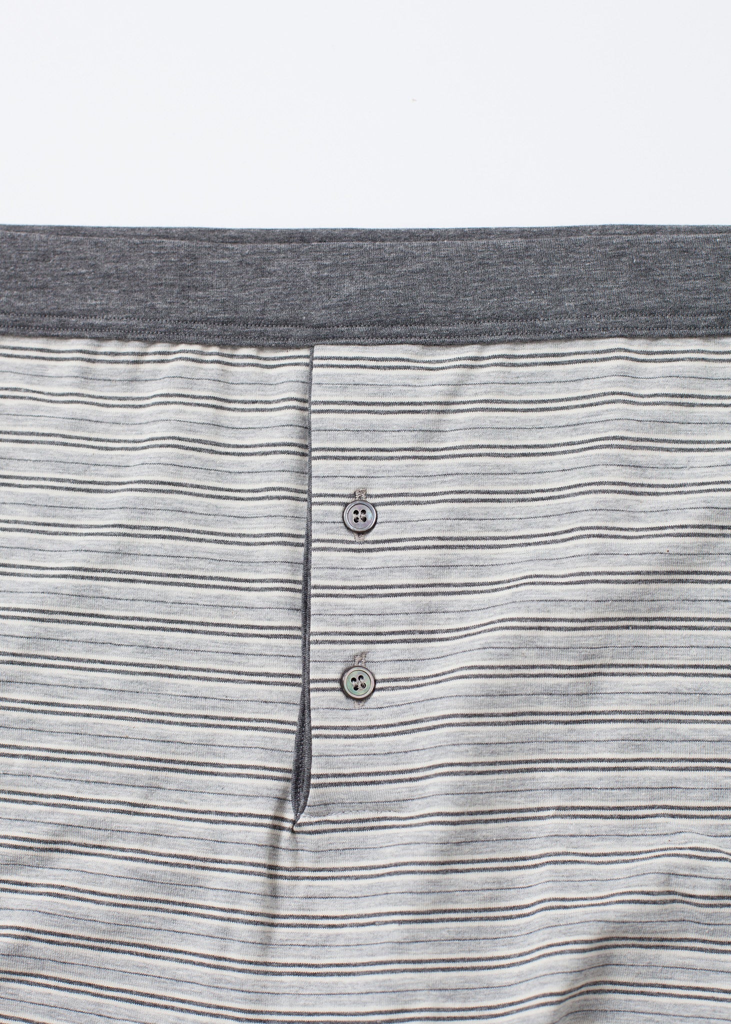 This prewashed cotton trunk is composed of the finest gauge for the softest materials. Offers stretch and softness in wear. Elastic waistband for ease. Etiquette. Color Heather Grey. 95% Cotton, 5% Elastane. Made in Italy.